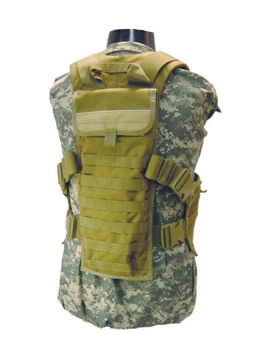 Load-bearing vest with a split-chest fastened by Fastex buckles allowing for rapid donning/doffing of the vest. Large amounts of PALS webbing allows for attachment of multiple pouches and equipment carriers.