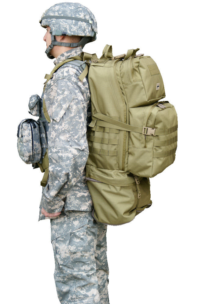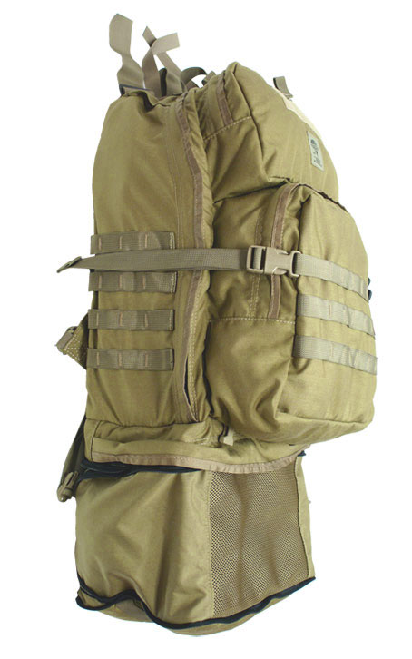 Outside panels are covered in PALS webbing to accept customized MOLLE compatible pouches. A Velcro pile allows attachment of an ID panel. Additional zipper compartments fit equipment, including M4/M16 magazines. Interior compartment includes a sleeve capable of accepting a hydration bladder.